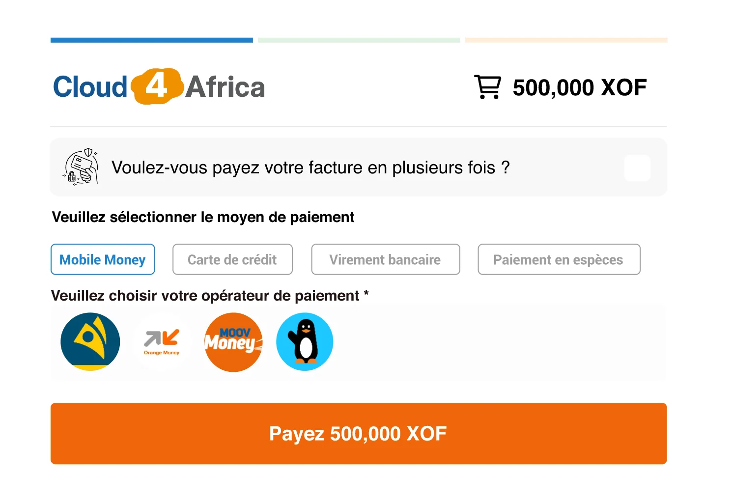Permet l’encaissement via une large gamme de moyens de paiement : Mobile Money (Orange Money, MTN, Wave...), cartes bancaires (VISA, MasterCard), virements bancaires, espèces, etc. Cette diversité garantit un maximum de flexibilité pour les utilisateurs.